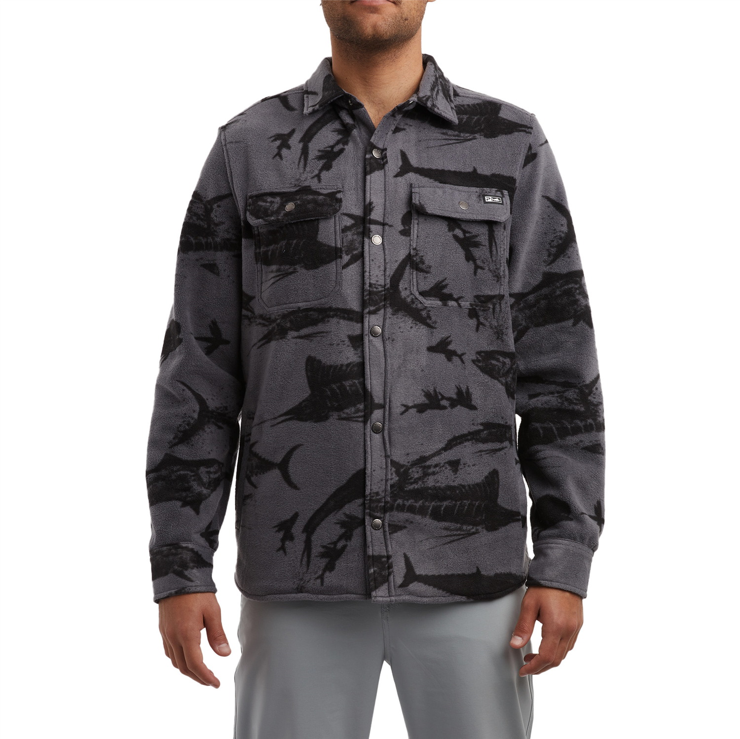 Providing everyday warmth and comfort, this heavyweight fleece features a black gyotaku print, as well as hand and chest pockets.